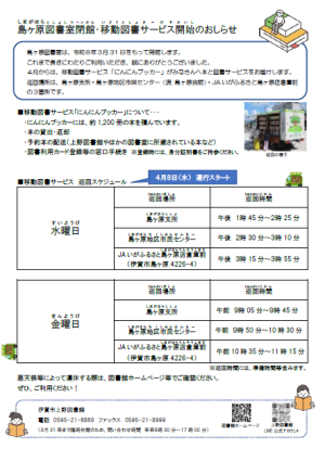 〇巡回時間は、島ケ原図書室閉館・移動図書サービス開始のおしらせ・大山田図書室閉館・図書サービス開始のおしらせをご確認ください。