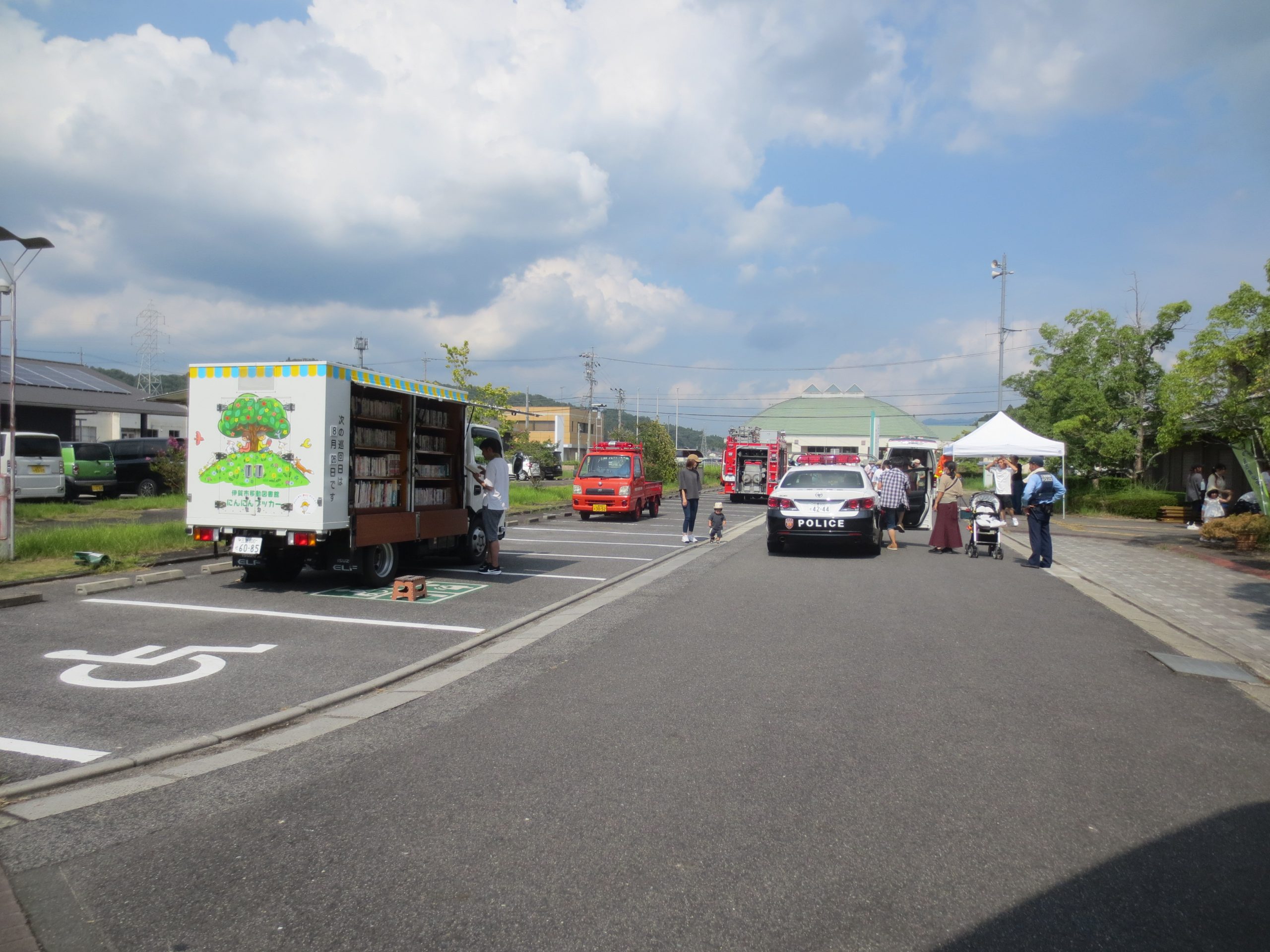 8月23日午後、阿山保健福祉センターで開催の「2025 こどもの集い」に移動図書館「にんにんブッカー」が出張巡回をしました。当日は、パトカーや消防車など普段近くで見ることができない車両見学や、ヨーヨー釣り体験などができるイベントが開催されていました。