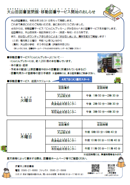 〇巡回時間は、島ケ原図書室閉館・移動図書サービス開始のおしらせ・大山田図書室閉館・図書サービス開始のおしらせをご確認ください。